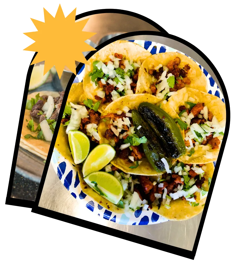 Al Pastor, Cilantro, Onions, Arbol Roja or Tomatillo Jalapeno Salsa and Lime.